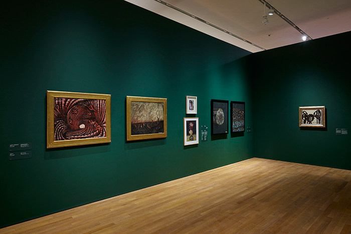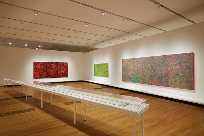 《輪回》(2011,最右側墻上畫作)于“草間彌生:一九四五年至今”展覽現場,2022年 攝影:鄭樂天 M+,香港