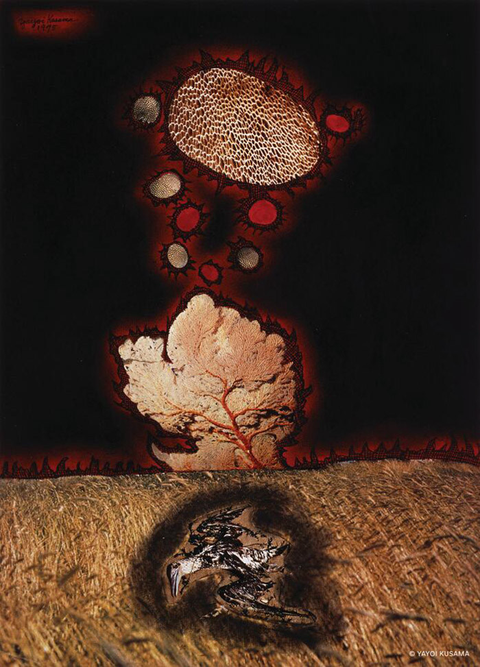 吉竹美香:其實草間彌生的創作逐漸被日本主流社會所接納,很大程度上是因為她的作品在不斷產生著變化。草間彌生紐約時期經常創作行為藝術作品,她的很多作品也會被日本媒體報道以便讓更多的人看到。但70年代左右的日本社會還是比較封閉和保守的,那時候他們還無法接受草間彌生的作品,因此草間彌生回到了紐約進行活動。后來草間彌生先后經歷了父親以及伴侶約瑟夫·柯內爾的去世,這一時期的拼貼畫創作比較灰暗,大多都是關于死亡的主題,1975年“從冥界傳來的死訊”回國首展展出了這些作品。也是從那時起草間彌生的精神狀態不是很好,入住了精神療養院,從此之后一直居住在那里。在1987年福岡北九州市立美術館首次回顧展,聚焦草間彌生在紐約時期創作的作品,1993年其代表日本參加威尼斯雙年展,草間彌生的藝術逐漸被接受,成為日本主流代表性的藝術家以及世界級的藝術家。
