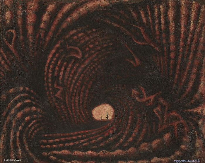 《殘骸的積累(人格解體帷幕的囚徒)》1950年油彩、瓷漆、種子麻布袋 72.3 × 91.5厘米 東京國立近代美術館藏?草間彌生