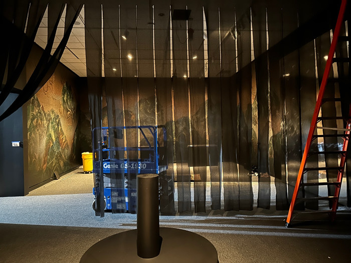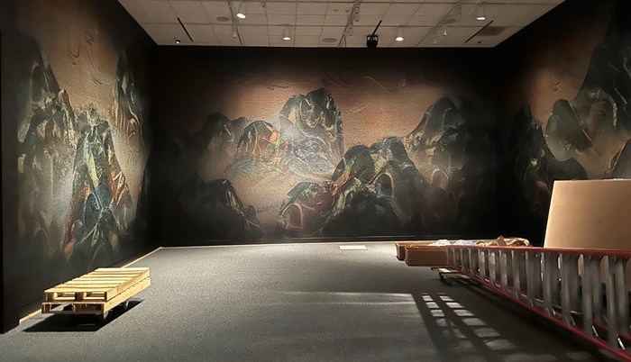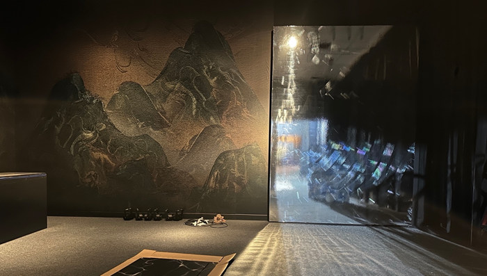 穿過紗幕,后面三分之二的空間,由于右側靠墻一堵巨大的鏡子而顯得豁然開朗。鏡子不是玻璃所制,而只是貼的金屬乙烯鍍鉻膜,所以人們所見的鏡像并非逼真。墻上依然是起伏逶迤的山巒,但風格迥異于“序幕”所見,現在從抽象轉入相對自然,有著濃重的油畫筆觸;山的形象也有了變化,隱隱約約出現了很多神獸的形象。壁畫回應了第一幕的主題,凸顯出那是一個神靈主宰的世界。