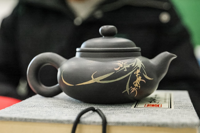 清華大學美術學院教授王建中與建水紫陶燒制技藝非遺傳承人黃倩,帶來《容祥壺》《大展宏“兔”》等多件紫陶作品,并在非遺展演互動區共同講解建水紫陶制作工藝與文化。