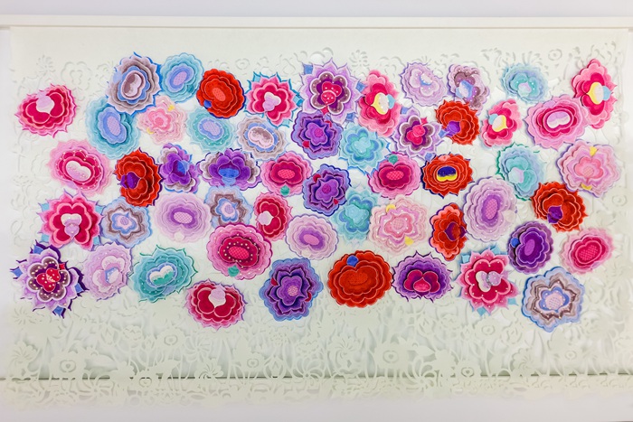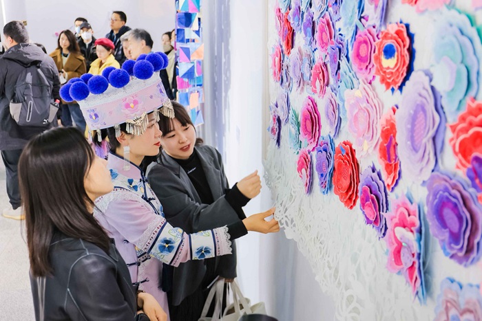 由清華大學美術學院副教授張紅娟與彝族刺繡非遺傳承人普明惠共創的《彝花百里》等系列作品,以牟定彝族刺繡為基礎元素,創作了立體花藝術交互裝置、汽車內飾等作品,表達彝族人民對于美好生活和審美意趣的追求。