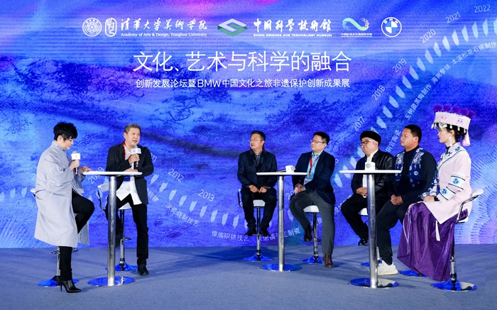 2月24日,“文化、藝術與科學的融合創新發展論壇”暨“BMW中國文化之旅非遺保護創新成果展”開幕式在中國科學技術館舉行。該展覽由清華大學美術學院、中國科技館、寶馬中國聯合主辦。該成果展匯集了“清華大學美術學院-BMW非物質文化遺產保護創新基地”的非遺文創精品,這些作品由清華大學美術學院導師和非遺傳承人以“一對一”“做中學”的研培模式共同創作設計,并首次在國家級展館面向公眾長期展出。