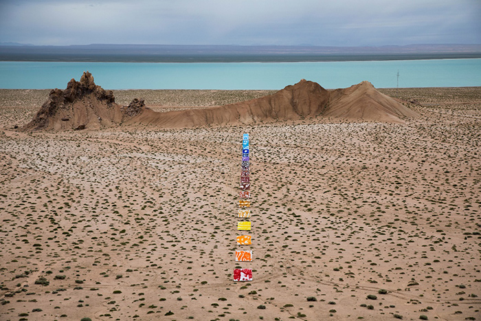 與自然的融入也體現在他的在地展覽中,自從在內蒙古額濟納旗的紅城遺址做了第一次在地展覽后,劉商英先后在新疆托克遜紅河谷、阿爾金山和天山持續完成一系列在地展覽。在阿爾金山,劉商英感受到彩虹乍現的瞬間,世界煥然一新的震撼,他在石山上按照光譜,將單色顏料拓印和涂抹在畫布上,隨后在曠野中將二十幅畫面一字排開,構成了《彩虹》宏大的在地展場,藝術與自然在此形成了奇妙的對話。