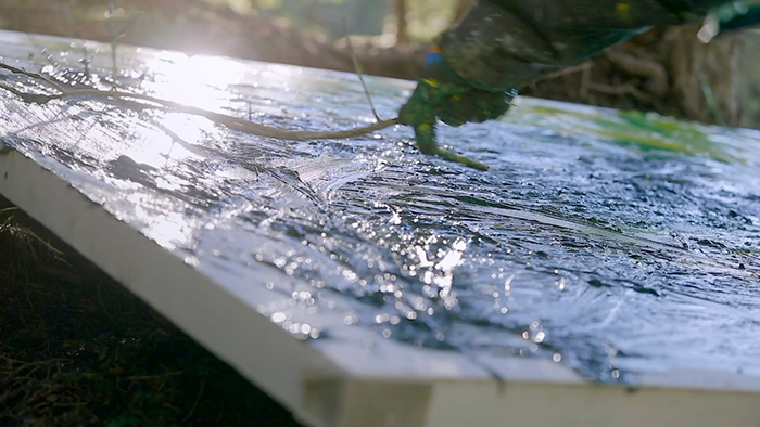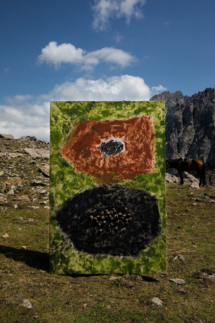 在天山的創作中,劉商英在森林里創作,樹林籠罩在朦朧的光線中,細碎的松針不時飄落在地上,越聚越多,劉商英索性將更多的松針拋灑在畫布上,為畫面增添了細密厚重的質地;他在天山河谷旁作畫,將地面上撿拾起來的羊毛涂抹上顏色粘在畫布上,形成了活化的肌理,更直接地呈現出現場的感受。