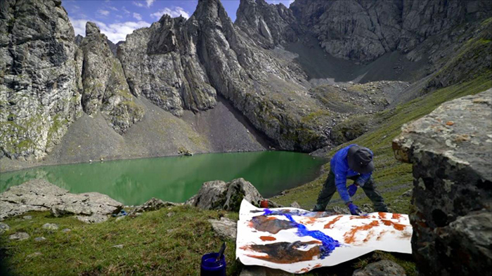 劉商英行走與繪畫的荒野之境遠遠超出普通人的感受,正如在他的影像中展現的,沙丘上的人如螞蟻般踟躕,數米長的大畫在山嵐中如紙片般微小。人在自然的尺度和能量面前微不足道。面對如此巨大的空間和能量場域,傳統學院溫文爾雅的繪畫方式無疑是失效的。