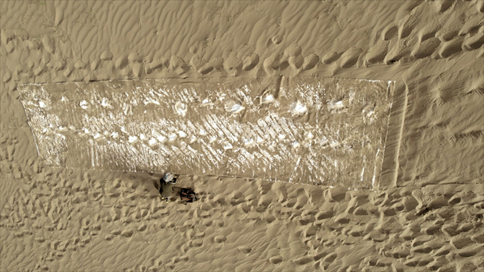 他開始更多地留意自然留下的痕跡。在阿爾金山海拔4000米的沙子泉,劉商英遠遠地看到野牦牛攀登到沙山頂上尋覓水源,他冒著脫水摔傷的風險跟在野牦牛身后,平行方向走了很久,野牦牛在沙山上留下的綿延足跡吸引了劉商英的目光,他將沾滿白色顏料的滾筒在巨大的畫布上涂滿,再將畫布覆蓋在牦牛的足跡上,沙山的起伏溝壑和牦牛足跡的寬窄深淺就完全拓印在畫布上。