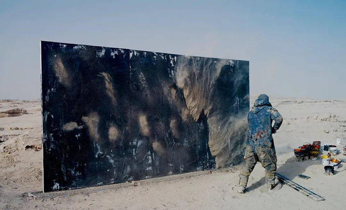 劉商英也慢慢順應了自然因素的介入。面對呼嘯的風沙泥土對畫布的侵襲,劉商英索性將沙土鋪灑在畫布上,將顏料和沙土凝固成一體,直接塑造成畫面的肌理。羅布泊惡劣的自然環境使繪畫行動難以一次性完工,劉商英的團隊就將畫布包裹好后,置入地面挖好的大坑中埋藏。待羅布泊漫長酷熱的夏季過后,再將畫布取出帶走,經過長時間土壤溫度濕度的浸潤,畫面也產生出一層時間的包漿。