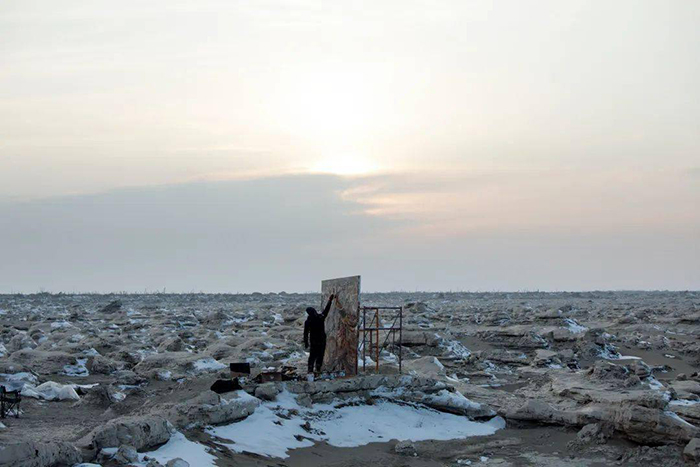 在羅布泊,它的不穩定狀態達到了一個比較極端的程度,這里曾多次發生探險死亡事件,普通人連正常行走都極為艱難,而劉商英卻在零下二十度的嚴寒中,裹著厚重的衣物,頂著狂風,在巨大的畫布上連續幾個小時作畫,畫架和畫布經常被狂風吹倒。他最深的體會是掙扎,身體處在一種失控的狀態。
