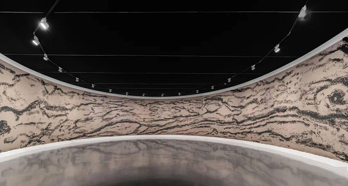 在展館入口處,1號展廳是一個布滿腳手架的環形展場,它是依據在羅布泊行走的螺旋型態勢建造而成,同時形成了一個被包裹的空間,還原了劉商英現場繪畫的氛圍。內墻上呈現了一幅劉商英在羅布泊創作的巨作《荒原計劃21號》。藝術家將一匹長38米的白色畫布鋪在羅布泊的雅丹地面上,用手蘸著黑色的顏料,沿著地面土石的肌理脈絡,將雅丹地勢的層巒起伏以觸摸繪畫的方式呈現出來。
