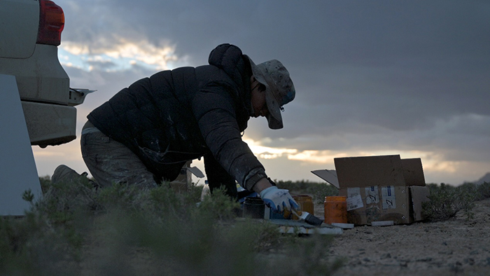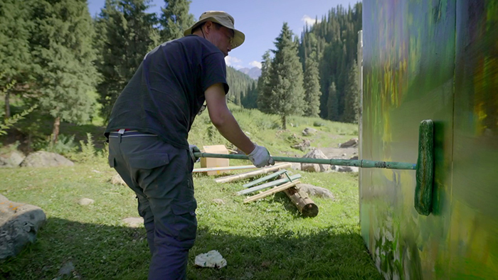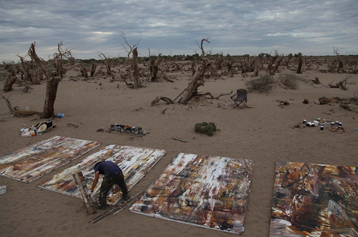 荒野寫生也意味著將自身暴露在自然的狂暴之下,要時常忍受風、雨、沙、石、蚊蟲、酷熱、嚴寒的侵襲。為了完成荒野行動繪畫,劉商英在假期之前必須做好目的地的詳盡調研和周密行動規劃,任何疏漏都將導致行動失敗甚至生命危險。之后他會帶領一支十幾人的團隊從北京長途奔赴荒野腹地,有時車輛在路上陷入泥濘,要挖幾個小時。他們搭起帳篷,吃著最簡單的食物,睡在睡袋或自制的火炕上。白天大家分工明確,有人負責引路,有人搭起腳手架,固定住巨大的畫框,攝影師負責拍攝劉商英的繪畫過程,待劉商英畫完后,大家再將畫材歸置好,用車輛運回北京。