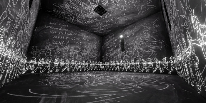 而“家”的概念也在作品中反復出現。在《輪回》中,“母親“的意象貫穿作品始末,她串起了人類在輪回中經歷的所有世界,象征著我們在不斷超越的過程中反復回到的一個參考點。而在《登月》中,宇航員雖在月球上,看到的卻是地球,我們在月球上漫步,卻發現自己不斷回到地球上維系我們自身的所有故事里。在《沙中房間》(2017),家是”父親“”母親“”孩子“”寵物“,是在黑板上書寫的一段段模糊不清的記憶。在《失身記》中,家的意向更加明顯,作者通過置換概念,將本來充滿人煙和歡聲笑語的家變成一個破敗而蕭索的所在,諷刺和悼念了受害者的遭遇。