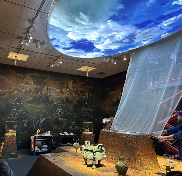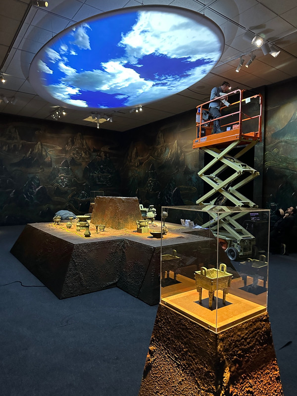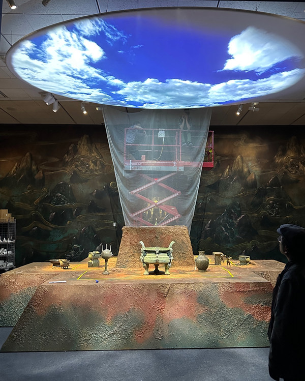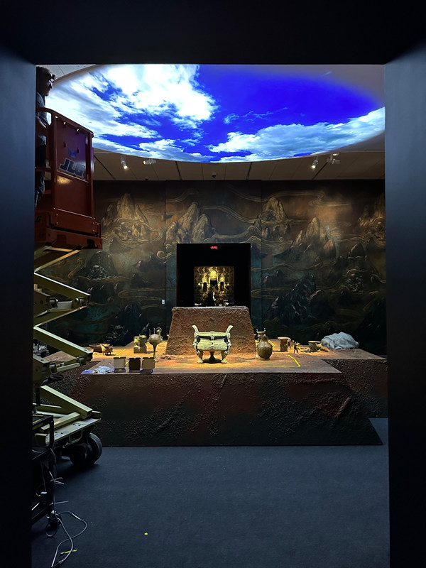 祭壇上擺滿了青銅祭器,圍繞著中間一個長方形凸起,內藏的電影放映機將藍天白云的影像投射到祭壇上方一個橢圓型的白幕上。祭壇中間一縷青煙裊裊升起,直抵天庭。