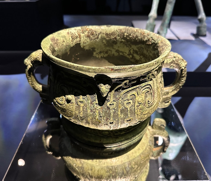 這個展廳中的燈光,被編排的美輪美奐:聚光燈讓中心展臺上的青銅器成了觀眾打卡的對象,而它們安身的小臺座上的鏡子,則克服了聚光燈的短處,讓器物下半部的細節清晰可見。