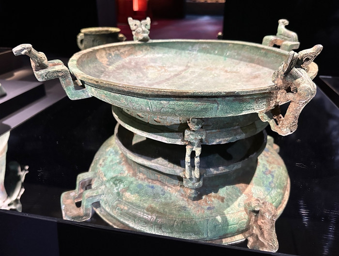 禮的觀念和實踐影響深遠,西周之后的東周乃至漢代都有悠久的回響。從西周到東周,人的形象越來越多地出現于青銅器中,展覽中一件西周盤,圈足上有三個半蹲的裸體男人,將盤抬在他們手上,他們顯然是社會底層人的形象。而另一件器物,一個約制作于前5-4世紀的青銅立人(可能是燈座),身上的袍服及鞋子的細節均由錯金絲表現,無疑是個貴族形象;這兩類人的表現,貴賤等級,涇渭分明。