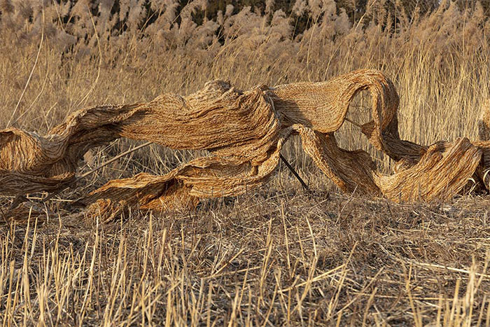 石梅:這幾件作品有的是取自音樂的體裁、題材,有的是對音樂作品的聯想?!缎邪濉肥且环N音樂體裁,它是音樂速度的術語,有自然流淌、優雅舒緩的意味。我選擇把《行板》放在戶外,是想加強這種抒情的靜止和風吹草低的動態之間的對話??莶莺徒z麻彼此輝映,配合一抹落日余暉更顯幾分朦朧和惆悵。一件作品的完成和呈現受到很多因素的影響,包括作品展示的場域,都會賦予它新的感覺和意義。