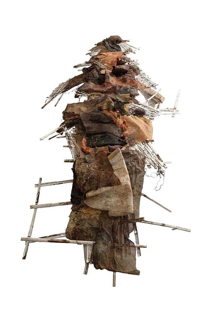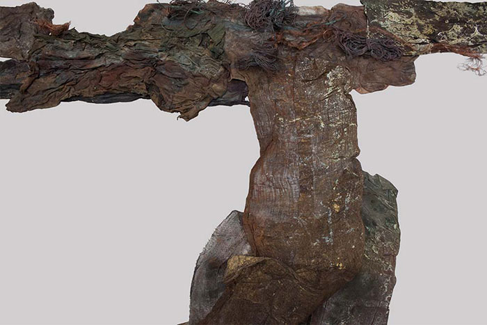 本次展覽中,藝術家石梅的最新作品《一刀流》展現了她在綜合材料方面的最新實踐。老舊殘碎的絲麻織物和帶有腐蝕感的金屬鐵絲,是石梅在作品中反復使用和表達的媒材,以礦物和植物染料精心又耐心地反復染就,石梅為她的作品賦予了一種時間的自然留痕。從早期作品《韻》到近年來的新作《一刀流》《牧神午后》等,材料的語義被不斷拓展和豐富。自然的留痕,起伏變化的形態,絲絲斑駁間演繹著敘述的不朽。