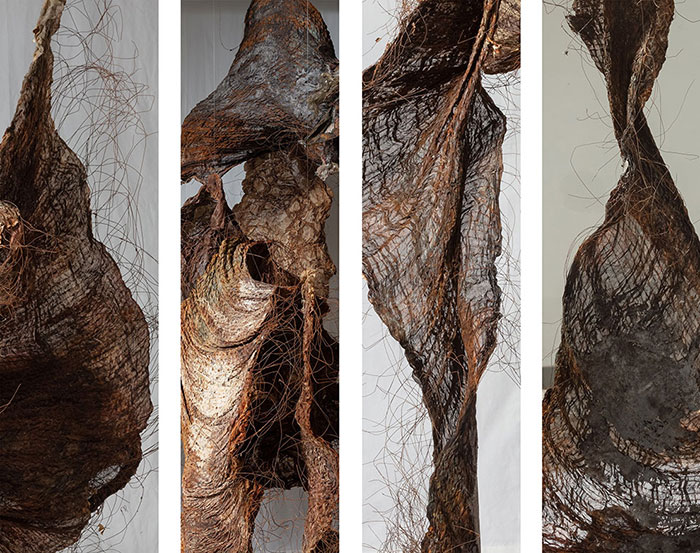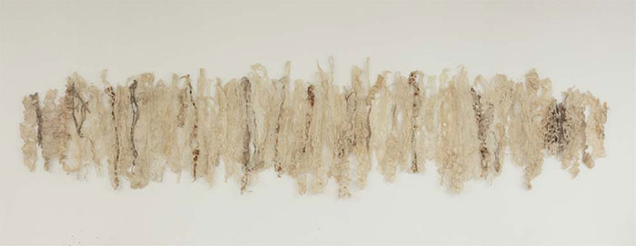 Q:絲麻織物和蝕化后的金屬絲是您在作品中反復使用的材料,這兩種材料給您什么樣的感覺?兩種材料語言在您的創作中經歷了怎樣的演變?