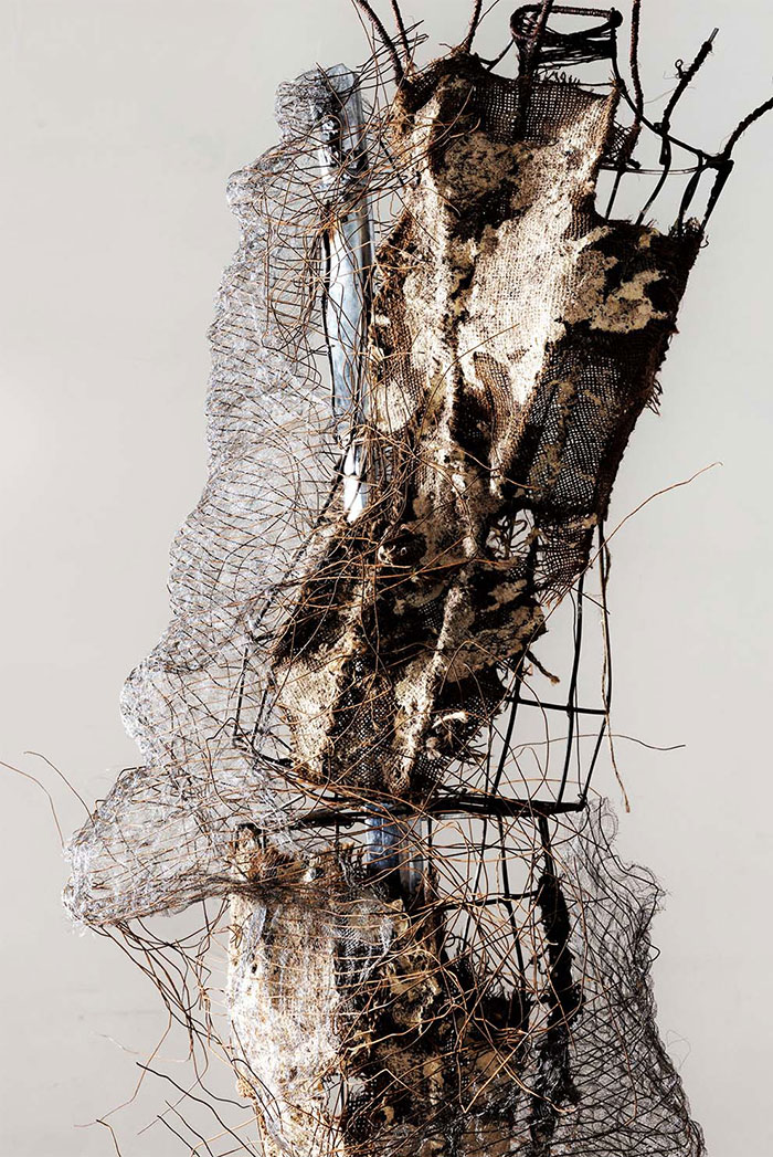 金屬材料也是我特別喜愛的材料,它既有獨特的光澤,也呈現經歲月磨礪鐵銹斑駁的滄桑,它的介入使纖維的姿態更多樣,同時也加強纖維的張力。它們之間相互映襯、對話和影響,相得益彰。