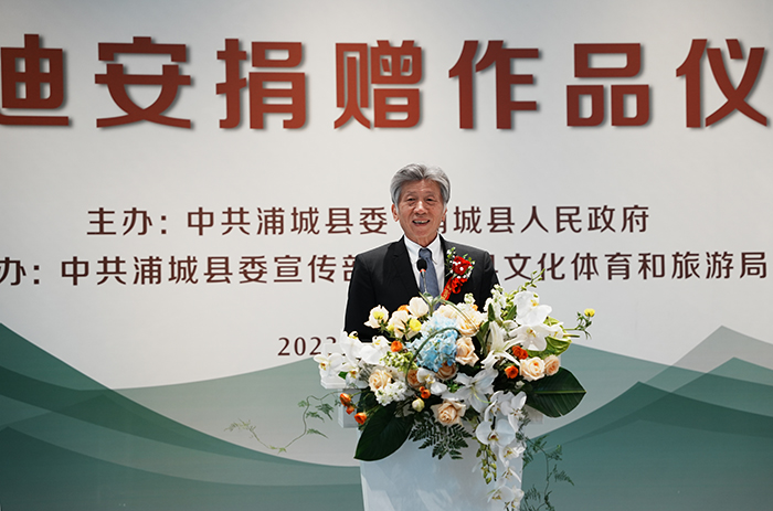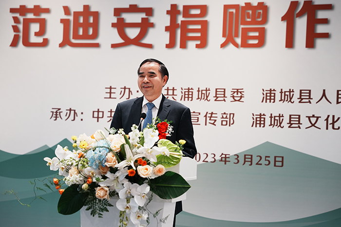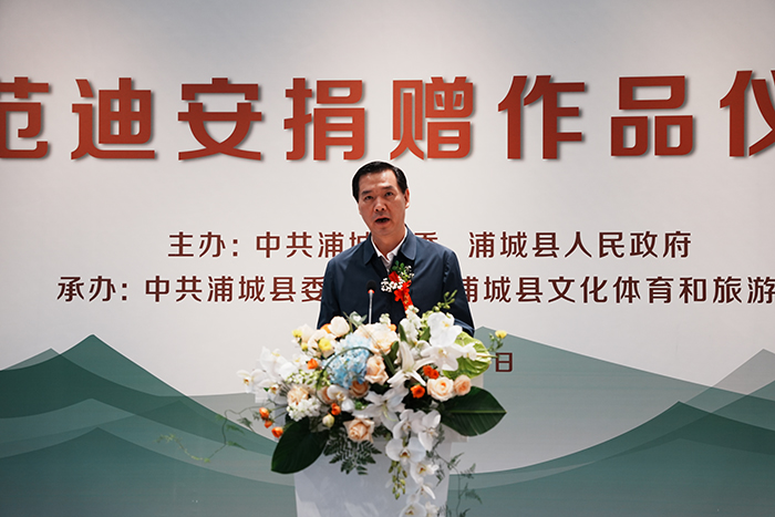 范迪安在致辭中表示,家鄉浦城是青山碧水、鐘靈毓秀之地,自古以來人文歷史積淀深厚,文化傳統養育人才。近年來,縣委、縣政府高度重視精神文明建設和文化傳承創新,以富有前瞻性的規劃布局,為人民群眾高品質生活需求提供文化供給。如今,在古代著名詩人江淹“夢筆生花”的地方建設浦城美術館,不僅讓美術館擁有悠遠而濃郁的人文氣息,更是千古文心一脈相承的重要體現。為此,他將把一大批油畫、水彩、書法作品捐贈給浦城縣,由浦城美術館永久收藏,同時,還將捐贈一批內容豐富的藝術圖書,在美術館內設立“美育圖書館”,回報家鄉、服務人民,希望能在以文化人、以美育人中發揮應有作用。