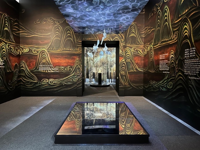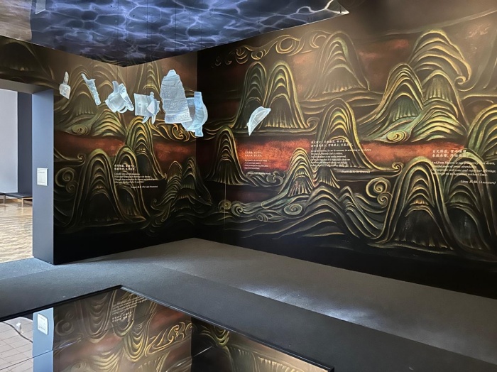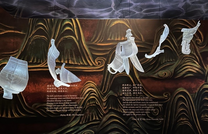 序幕《場景設定》,其中的群山壁畫、出自《詩經》的詩句、懸幕,鏡子以及懸浮的3D打印“青銅器殘塊”