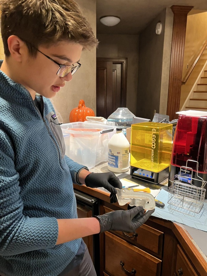 山姆接下來幾周緊張、累人的項目就此開啟。山姆平時給我的印象是一個稍微有點內向和害羞的的男孩,但是他對這項工作所表現出來的熱情、專注與責任感,讓我刮目相看。他現有的打印機無法打印我們需要的透明材料,他于是研究了什么型號的打印機可以滿足材料的要求,在父母的支持下,獨自采購和裝備了新的機器。我們要求每個“殘塊”的長度大約在33厘米左右,山姆的打印機無法打出這么大的東西,所以不得不分成幾塊來打印,完了后再粘起來。每一個“殘塊”的打印時間大約需要花7-8個小時,時間緊迫,山姆于是讓他的打印機除了他上床睡覺以外,連軸轉地工作。他安裝了一個攝像頭,以便在上學時從手機上監控打印機的工作狀況。在這期間,山姆和我有許多互動,他媽媽也不斷地報告進度,分享山姆帶著防護面罩工作時的照片。緊趕慢趕,十塊“青銅器殘塊”終于在開幕前的最后一周完成了。