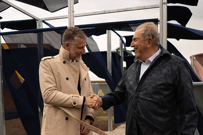 Andrea Boragno:這是一個采用Alcantara材料制作而成的建筑結構,其外觀讓人聯想起圍欄,仿若一個秘密花園,希望以此來表達守護、贊美、培育周圍自然環境的理念。四個“房間”的墻壁由各種色彩柔和的Alcantara材料制成,讓圍欄更加生動,不同尺寸的孔眼設計為其注入一份個性,以此來玩轉光影的游戲,在準備播種的土地上形成自然的陰影。在門戶裝置中,參觀者可以親眼目睹大自然的元素,觀賞路過的飛鳥,參觀者還可以通過“窗口”把種子扔進去,播種洋甘菊、向日葵和海薰衣草等植物來培育土地,親自參與此次以環保為題的藝術裝置。