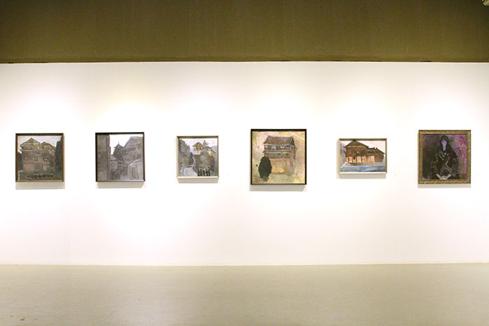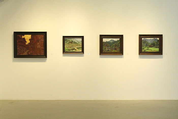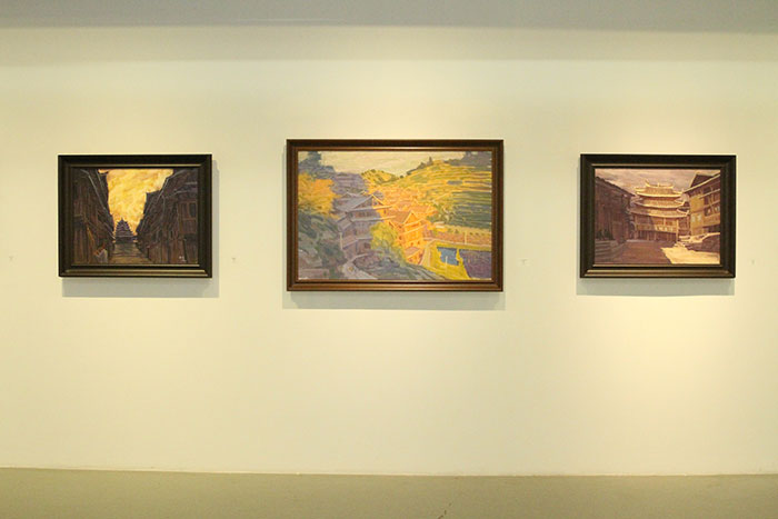 同為展覽學術主持的油畫家秦燁教授是此次寫生活動的主要召集人,秦燁于今年2月和4月曾兩次到訪侗寨。從他的作品中能夠明顯感知到侗寨在兩種季節氣候下的風貌差異?!敖衲?月份,我與幾位藝術家第一次來到廣西三江,我們去的時候第一感覺是冷,這里白天最高氣溫只有五六度,每天都是陰沉沉黑乎乎的,所以那時畫出來的畫沒有太多色彩,整體色調也偏陰沉陰郁。后來到4月份初春時我們又去了一次,這次的感覺是春天的綠意明顯多了一些,但天氣還是很冷,時常下雨。侗寨有一種神秘的特質非常觸動和吸引我??赡芤驗闅夂虻木壒?,那里的房子因為經年累月的潮濕多數都會變黑,再加上當地人在建筑的外立面也會刷黑漆,更平添了一種神秘感和分量感。那些建筑和房屋,高低錯落著,你能品味到一種節奏的韻律感,這都是我在繪畫中關注和表達的,一是流動變化的節奏韻律,二是色彩的濃重感與分量感?!鼻責钫f到。