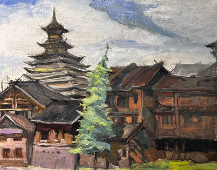 曹星原,《侗寨鼓樓》,50x40cm,2023年