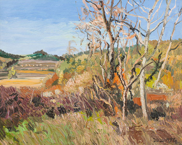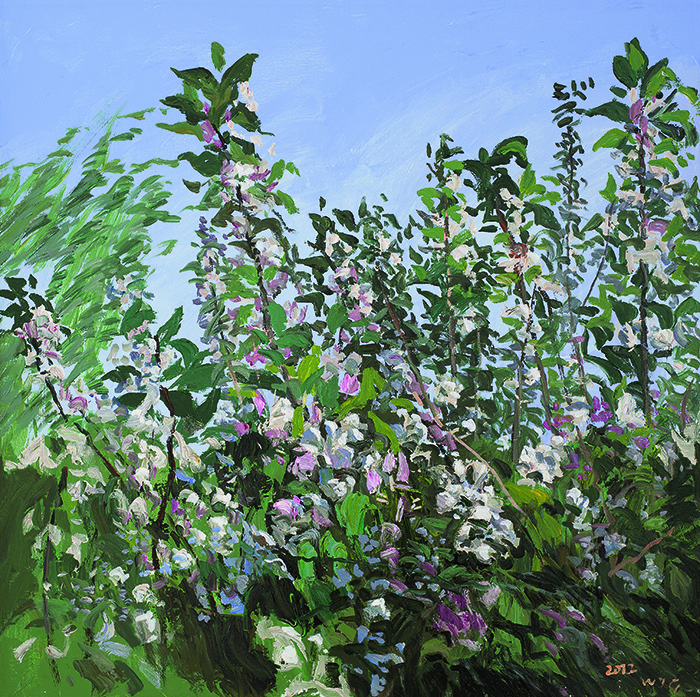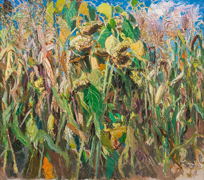 走出城市,走向田野,是藝術家內在的沖動。王建國用“寫意性”的油畫語言勾勒著生態文明建設中的美好圖景,春華秋實是其最為質樸、本真的傳達。該版塊的作品以畫家行走于東北大地和全國各地寫生的風景畫創作為主。他筆下既有北方廣袤的原野,四季更迭的長白景色,又有咫尺之間的作物,郊外盛放的葵花。人們在梨花樹下駐足、在田地里耕作,鄉間飄蕩著春的私語、夏的詠嘆、秋的贊歌、冬的低喃。肆意的陽光與自然生命交相輝映,強烈的色彩與流動的筆觸碰撞交響,頌揚著黑土地的恩澤,豐饒的生命景象,傳達著“生生觀”的精神寫照,抒發著藝術家對家國故土的無限深情。