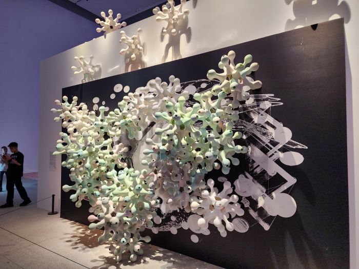 法國當代藝術家托尼·布朗參展的作品是NEBULA/Two birds in a Tree,在作品中,微觀與宏觀、細胞與病毒、身體與自然世界神奇地融合在一起,是如此的魔幻而真實。微觀的自然世界細胞可以對應宇宙銀河,細胞就是世界的最基本單位,藝術家似乎天然就有一種去發現世界秘密的直覺。