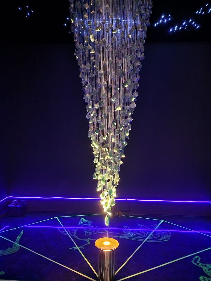 張燕妮的作品《死事如生羽化升仙》選用了西漢南越王墓中的玉璧造型作為作品的中心,用青玉原石材料懸掛,利用激光燈柱向上構成的錐形光束將帶有靈氣的玉石送向天體。作品提煉了抽象的視覺圖像和象征性的物質材料來表達漢人羽化成仙的思想。