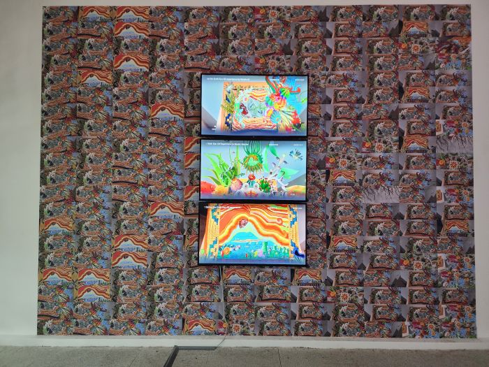 金昌烈的參展作品《人工智能和曼陀羅》從曼陀羅的圖像和符號入手,試圖表達曼陀羅的世界,并用人工智能進行轉譯。人工智能已經學習了唐代圖像、韓國傳統圖像和曼陀羅的圖像,并創造出新的圖像。視頻從一種繁復的角度來展示一個多維空間。