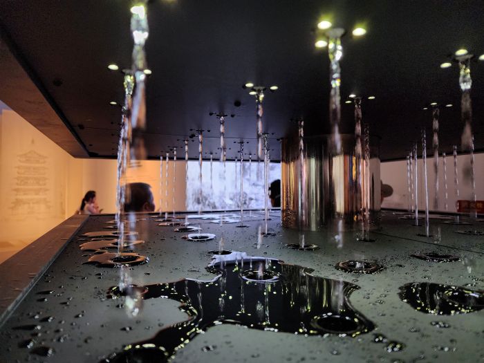 新銳互動媒體藝術家呂連濤的參展作品是《倒流-時間的縫》,兩塊簡潔的方形石材被中間的水珠隔開,水珠為懸浮上升狀態。兩塊方形石材類似“方鼎”——代表天與地,而“虛”的水珠倒流象征著時間。他的作品有一種哲學化的悖論思考,從觀念語言的角度去展開隱秘的討論。