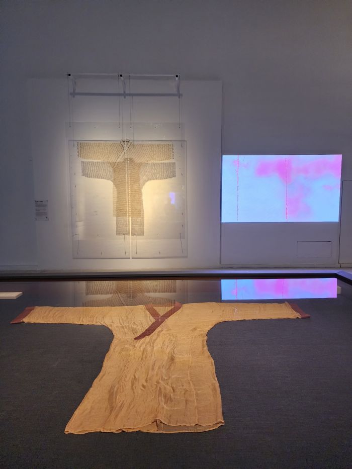 梁紹基是一位隱居在浙江天臺山,養了三十幾年的蠶,用蠶與絲創作的當代藝術家。此次他用《平行隧道》與《8字謎》兩件作品來對話漢代的《素紗單衣》。素紗單衣的材質成為梁紹基對話的橋梁,《8字謎》是揭示了蠶吐絲的軌跡路線,《平行隧道》則用蠶絲構建了一個通往歷史與未來的空間。梁紹基在全球化數字時代用生命經驗和藝術創作去重新討論漢代先民們的智慧與生命哲學,日復一日的生活就是生命的真諦。