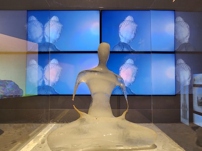 嘎德是來自西藏的藝術家,他的參展作品是《冰佛》。他取拉薩河的水,將其凍成冰,并雕鑿成一尊釋迦牟尼佛像。并讓這尊冰佛自然融化,重新還原成水。背景則是佛像的數字化照片,從佛教的觀念來講一切都是夢幻泡影,一切都是虛妄,藝術家在佛法的智慧里去闡釋生命、時間、空間的生長與消失。