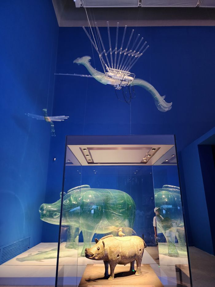 張沐辰的參展作品《數字豬尊》與湘博的國寶級藏品“商代豕形豬尊”展開多媒體互動對話。藝術家把“豬尊”轉換成一個巨大透明的充氣模型,祭祀和神話的功能被解構,反而變成了一個可視化的三維模型??罩型该鞯娘w鳥與視頻結合,構成了一個真與假的荒誕劇場,一個處于歷史和高科技之間的景觀。