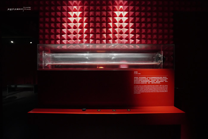 而在暗紅色調的“聲音是什么”的科普展區,觀眾仿佛進入了一個幽靜神秘的世界,這里有手機拍攝畫面出現倒流的“聲波噴泉”,有能將透明管中的聲波可視化的昆特管;最好看的就是“音流學”,水或沙粒在聲音震動之下呈現豐富的圖形變幻,如雪花一般細膩精巧。