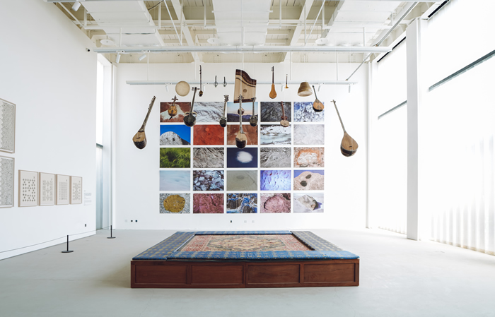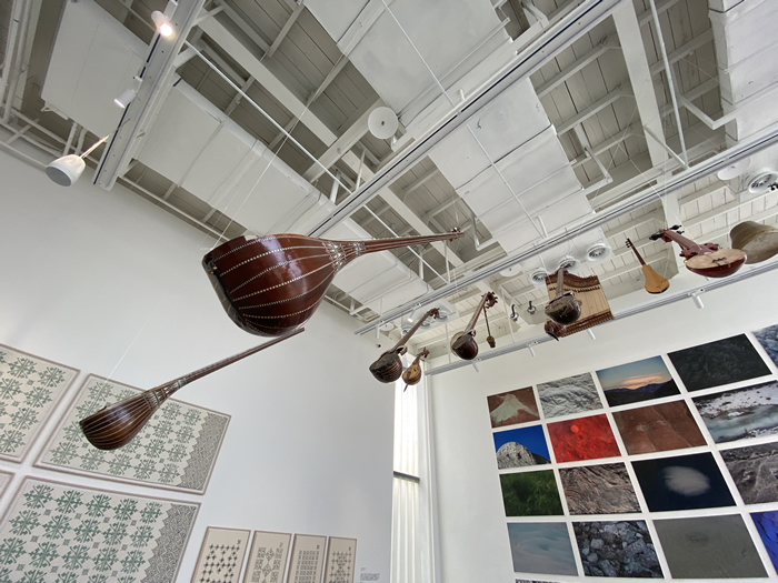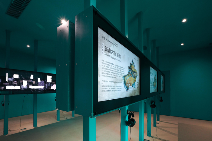 進入綠色的語言展廳,這里展出了一千多年以來消失的新疆地域的語言文獻,觀眾可以通過互動裝置傾聽學者朗誦的古代新疆各種語言。隔壁的音樂空間,整齊排列著六個藍色裝置罩,觀眾在里面可以安靜地聆聽來自和田的音樂。進入敞亮高大的“和田和聲”展廳,正中央懸掛著17種新疆傳統樂曲,四周墻壁上展示著和田音樂人的影像作品,以及莊輝、旦兒的攝影和圖案繪畫作品。