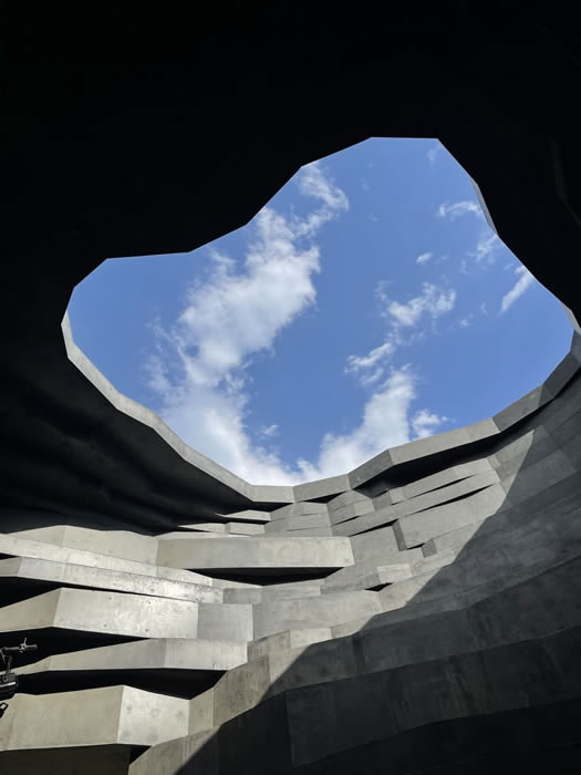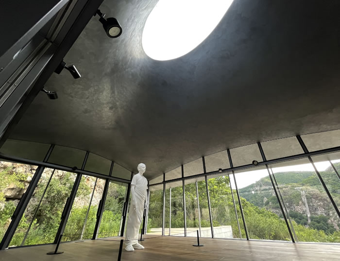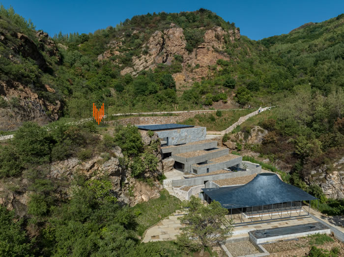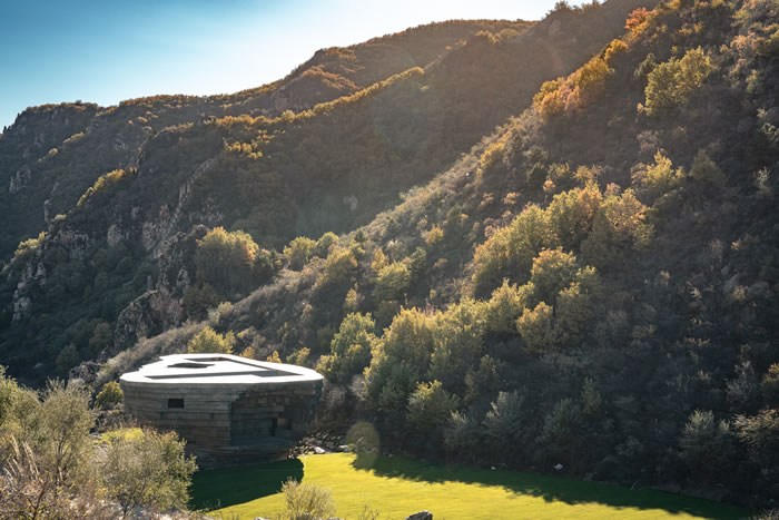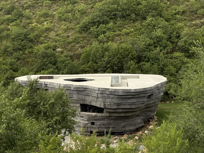 山谷音樂廳是阿那亞·金山嶺社區的地標建筑,也是第一條徒步路線的必經之路。它如同一座人類文明的航母鑲嵌在綠意蔥蔥的山谷中,與自然同行。整體的清水混凝土與周圍山脈的沉積巖相融,倒錐形的外觀如同一塊天外飛石,其頂部開口射入四時天光,仰臥其中看云卷云舒,天色流動美不勝收。雖然總體空間并不龐大,但每一處留白和開窗都格外講究,人在其中成為自然之景,景在窗外仿佛天然畫卷。據悉,該建筑2018年曾獲得第66屆美國P/A建筑獎(進步建筑獎);2021年,獲WALLPAPER 2021年最佳公共建筑設計大獎以及香港工程師學會頒發的卓越結構嘉許獎。在2022年正式投入使用后,歌手李健線上演唱會《向往》就在這座阿那亞山谷音樂廳舉行。而大地藝術節期間的一些列文藝演出及活動,也都將再次煥發這座山間的美麗建筑,足以令人拭目以待!