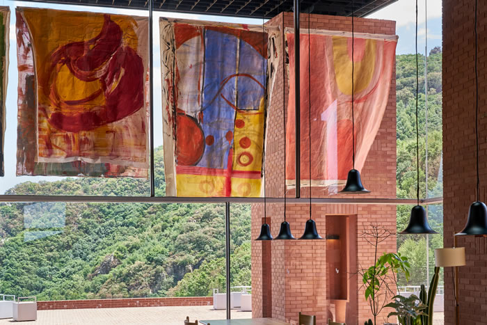 如果你恰巧在日暮時分來到Y餐廳的平臺,你會看薇薇安·蘇特在這里留下的美妙布幡,它們在夕陽的余暉中迎風飄展,有時還會發出帆布抽打的聲音,它們仿佛被藝術家賦予了靈魂,在這里恣意招搖、翩翩起舞。薇薇安·蘇特的這組作品不起名,也不標注創作時間,她希望將作品融入自然,在風吹日曬中與這片土地共同生長,風雨帶來的印記將成為作品延續的未來之筆,藝術家將對自然的直接感受轉譯為抽象色彩語言,繪制在這無框的畫布上,并大膽而富有野心的邀自然共繪。