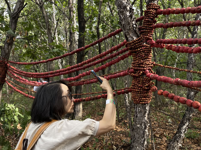 在另一段山路中,王一一的作品《紅果》令人印象深刻:藝術家收集金山嶺當地盛產的原生山楂,選取4種山楂共計10萬余顆穿起了總長2公里的裝置藝術作品,而在這一勞作中,王一一把當地居民納入其中,邀請他們共同參與其中,以社區共創的方式完成了最終的作品?;鸺t的山楂錯落交織在山林之中,明艷而芳香,在日曬雨打或是動物的啄食下作品將經歷另一番變化,而這份因自然而引發的不確定性也將被納入作品的一部分。