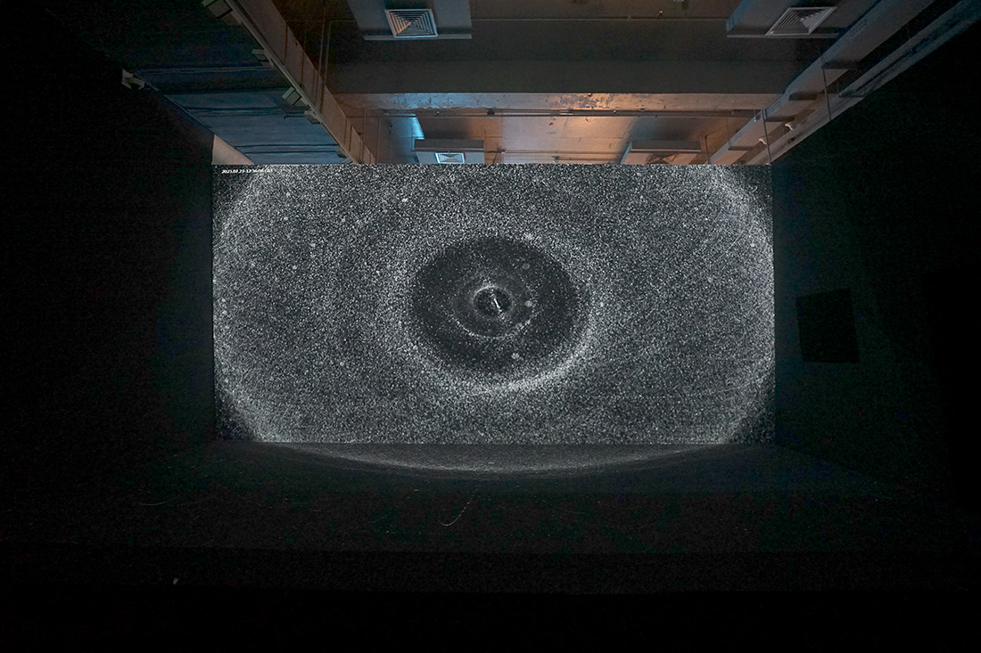 《軌道》,Quadrature,2023。朱利安·戈茨和塞巴斯蒂安·尼特的作品《軌道》則展示了衛星和太空垃圾圍繞我們旋轉時的詩意舞蹈??此苹靵y的路徑變異為有機的視覺模式,背后實則是物理規律的產物。(攝影:蘭紅超)