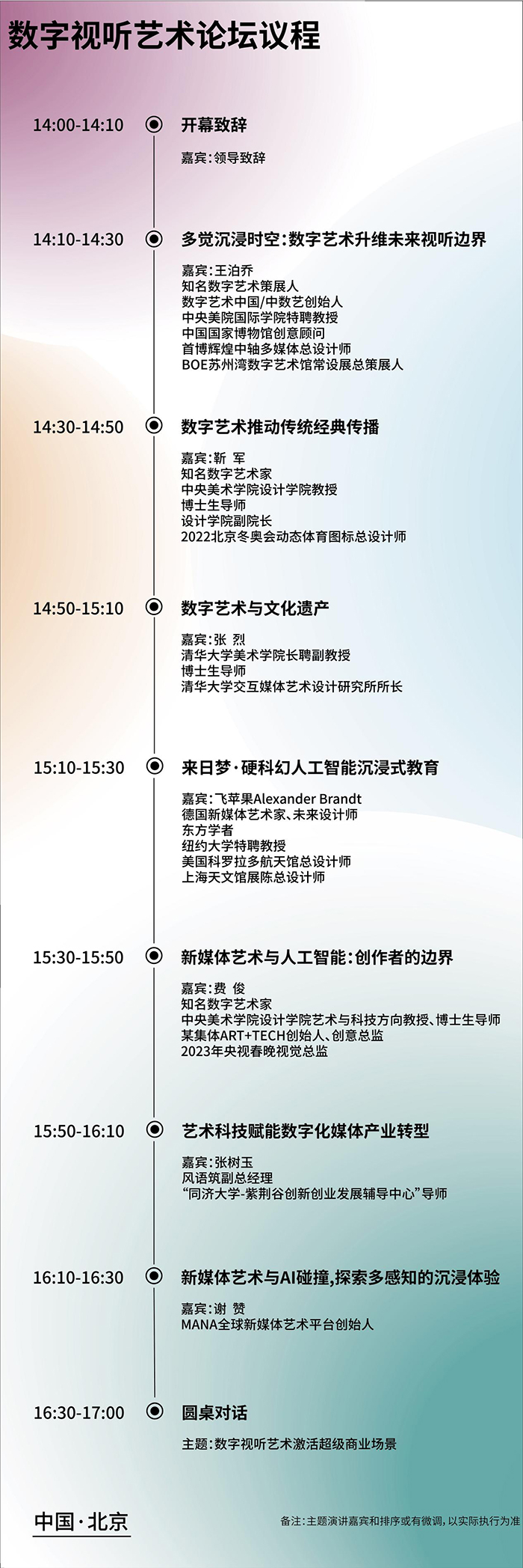 主題演講部分將邀請多名行業專家、高校學者、數字藝術與商業運營從業者進行專題分享。這些將數字藝術理論與行業實踐并行研究的“高人”包括:知名數字藝術策展人、數字藝術中國/中數藝(DAC)創始人王泊喬,中央美術學院設計學院教授、設計學院副院長靳軍,清華大學美術學院長聘副教授、博導、交互媒體藝術設計研究所所長張烈,以及知名數字藝術家、中央美術學院教授、博導費俊,德國新媒體藝術家、紐約大學特聘教授、美國科羅拉多航天館總設計師、上海天文館展陳總設計師飛蘋果(Alexander Brandt),全球新媒體藝術平臺MANA創始人謝贊,中國數字文化行業龍頭企業風語筑副總經理張樹玉。一場堪稱國內數字視聽藝術領域的“華山論道”即將精彩上演。