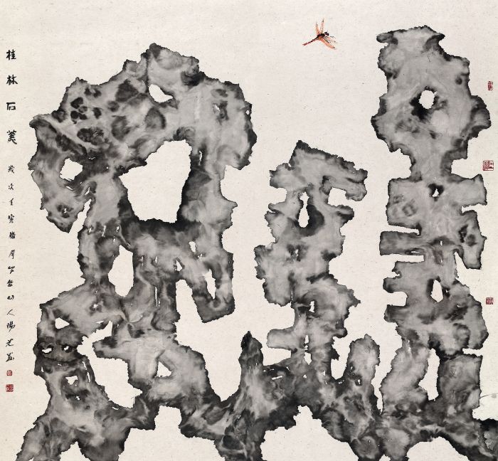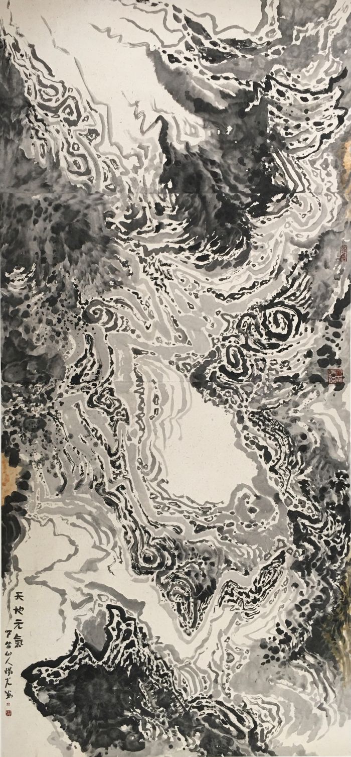總體而言,陽光所聚焦漓江的山石、花草樹木,通過潑墨加皴擦點染、濃淡相破的技法,保留作畫過程中的偶然性因素,畫面布局吸收現代構成的表現方式,同時保留中國畫的筆墨語言,力求一種中西融合的水墨畫新氣象。在這其中,他所用到的技法是潑墨——水破墨或者墨破水,特別是在大幅作品中撞水、撞墨、撞彩,升華筆墨的美感,從而達到具有沖擊力的視覺效果,這需要大破大立的勇氣。