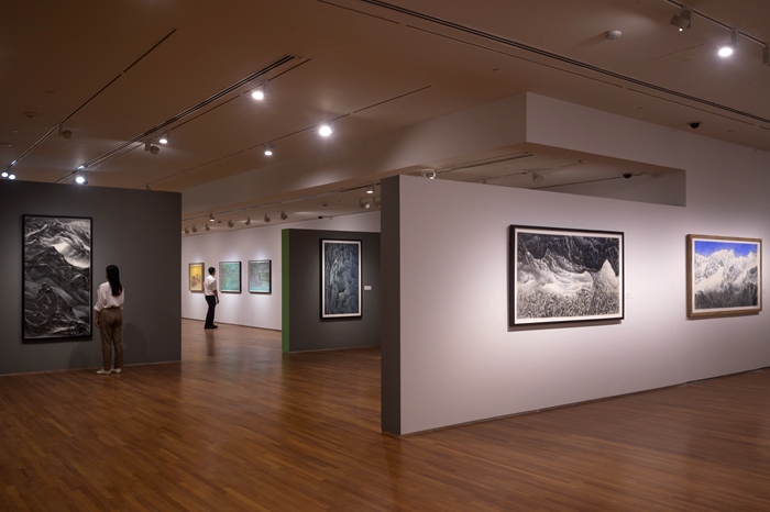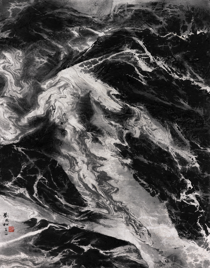 1980年代開始,劉國松重返中國大陸各地游歷。“水枕能令山俯仰”部分主要呈現了2000年之后,他以四川九寨溝和西藏雪山為題材進行的創作。2000年,劉國松應邀赴西藏大學講學,他提出要去珠穆朗瑪峰。當時劉國松注視著珠峰壯麗的風光,不知不覺過去了兩個小時,全然忘記了高原環境的艱苦惡劣。下山之后,左耳突然失聰,至今未愈。2001年,劉國松被九寨溝絕美的水景深深打動,回到畫室后多次實驗表現的方法,最終發現了用建筑繪圖用紙與宣紙結合,采取一種新的漬墨法,可以表現九寨溝水光交融、瀲滟方晴的景色。在展覽的最后版塊,除了巨幅的雄偉雪山之外,不少大型作品正是劉國松對九寨溝水景的表現。