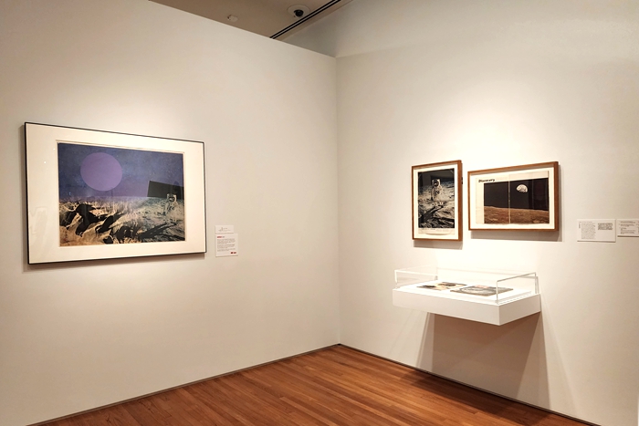 1960年代,劉國松受邀赴美旅行,此時也正值人類登月的年代。1968年12月,阿波羅八號環繞月球飛行時,第一次從月球拍攝下地球的照片。劉國松看到這張照片,感動不已。創作的名為《地球何許?》的作品獲得當年美國“主流‘69”國際美展繪畫首獎,劉國松的“太空畫”系列就此誕生。這一板塊中,陳列著1969年的《生活》雜志,旁邊是劉國松從雜志上撕下阿姆斯特朗月球行走的照片拼貼創作而成的水墨作品《月球漫步》。也許當時人們沒有意識到,這是一名東方人用水墨的方式對國際事件的一次歷史性記錄。
