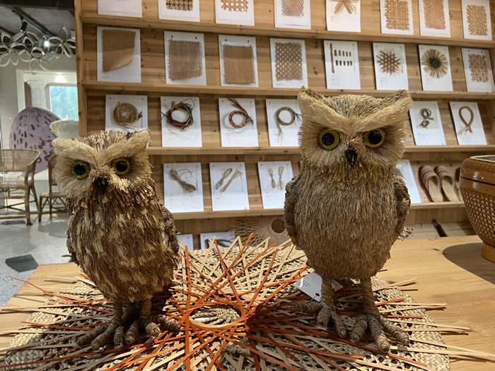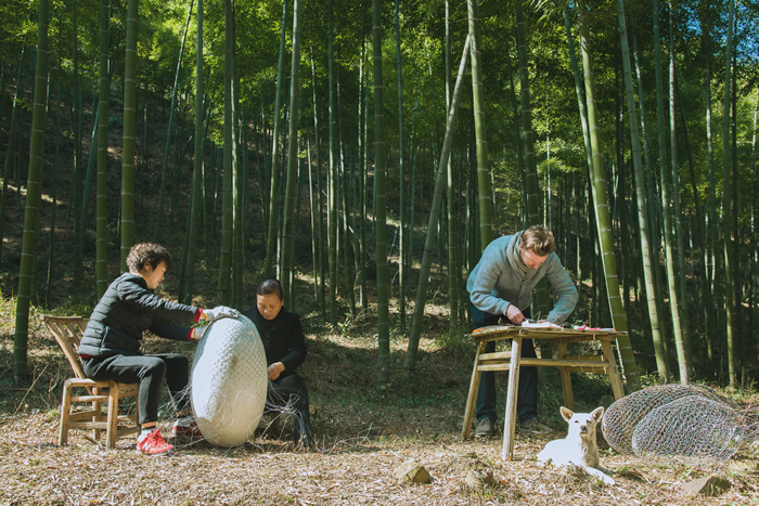 開幕式后,張雷開車帶筆者去參觀他的工作室,車子穿過一片靜謐的竹林,在一個大院前停下,這里就是“品物流形”公司所在地,主樓是一座夯土工藝建筑。這里遠離村舍民居,林木蔥郁,很難想象在這樣安靜的山村里隱藏著一座巨大的“設計實驗工廠”。張雷帶筆者參觀了公司內的工廠,研究和生活空間。張雷介紹,這里面堆放的展飾很多是給江南布衣、愛馬仕等品牌設計的樣品。公司現在四十多人就住在村里,他們分為傳統工藝研究、商業、展覽等很多項目組,設計師與村民也經?;咏涣?,教村民手工藝,共創作品。