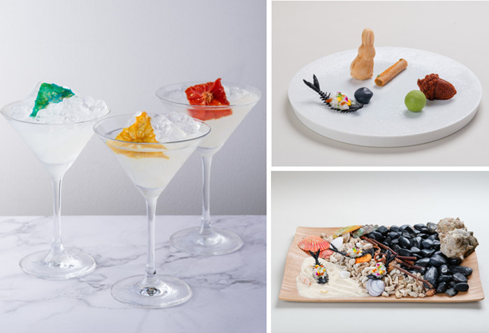 (左)小林正人,《Lemon Cocktail on this Planet》,2023年東京藝術周酒吧委約創作的雞尾酒。圖片由東京藝術周提供;(右)石井真介為2023年東京藝術周酒吧創作的美食。圖片由東京藝術周提供。