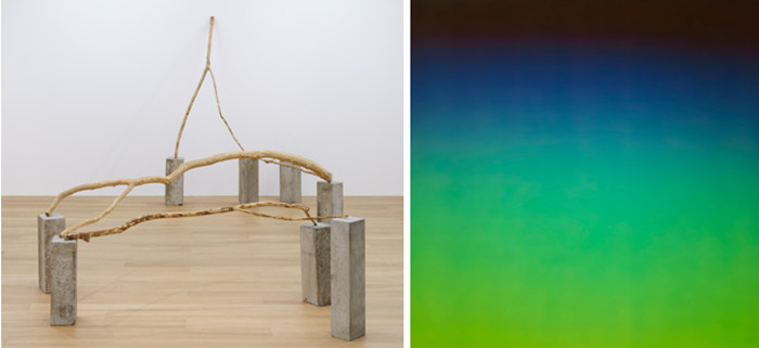 (左)菅木志雄,《Divergent Space》,1975年,木材及水泥磚,184 × 216 × 456厘米。小山登美夫畫廊呈獻。 (右)杉本博司, 《Opticks 016》,2018年,顯色打印,119.4 × 119.4 × 7.6厘米。小柳畫廊呈獻。